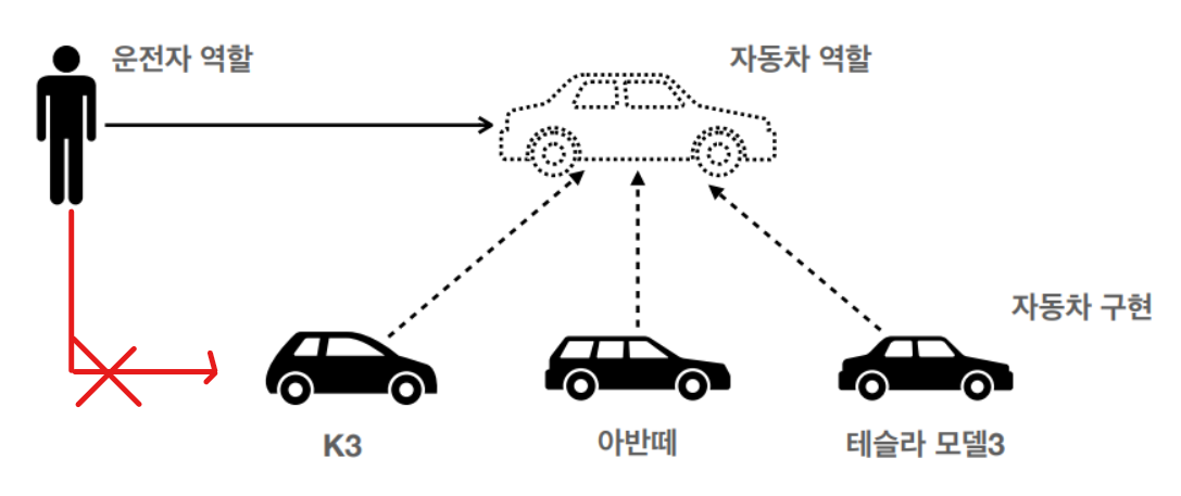 DiscountPolicy가 자동차 역할, FixDiscountPolicy와 RateDiscountPolicy는 K3, 아반떼, 모델3라고 할 수 있다.